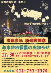 年末年始の営業お知らせ 2025 12/30 未分類 2025年内の営業は本日午前中で終了しました。営業再開は2026年1月5日(月)からとなります。 本年は皆さま当店をご利用いただき、まことにありがとうございました。 来年も何卒宜しくお願い致します。 未分類 この記事が気に入ったら フォローしてね! Follow @hamazakifuel Follow Me よかったらシェアしてね! URLをコピーしました! 浜崎燃料店 年末特別・通し営業実施のお知らせ 関連記事 浜崎燃料店 年末特別・通し営業実施のお知らせ 2025~2026年 灯油配達 繁忙期開始! 2023~2024年シーズン 配達灯油 受付中
